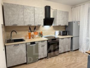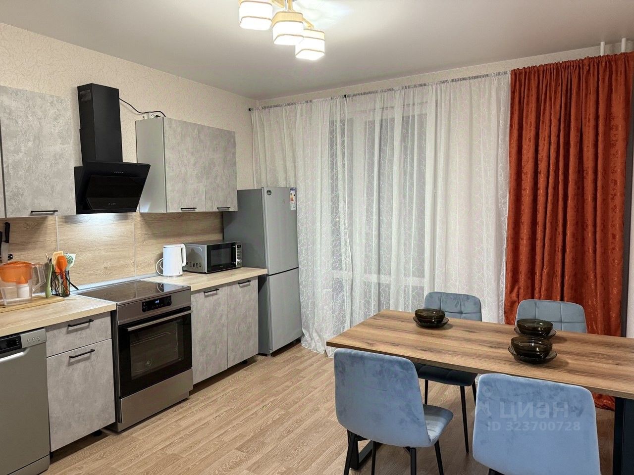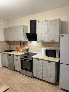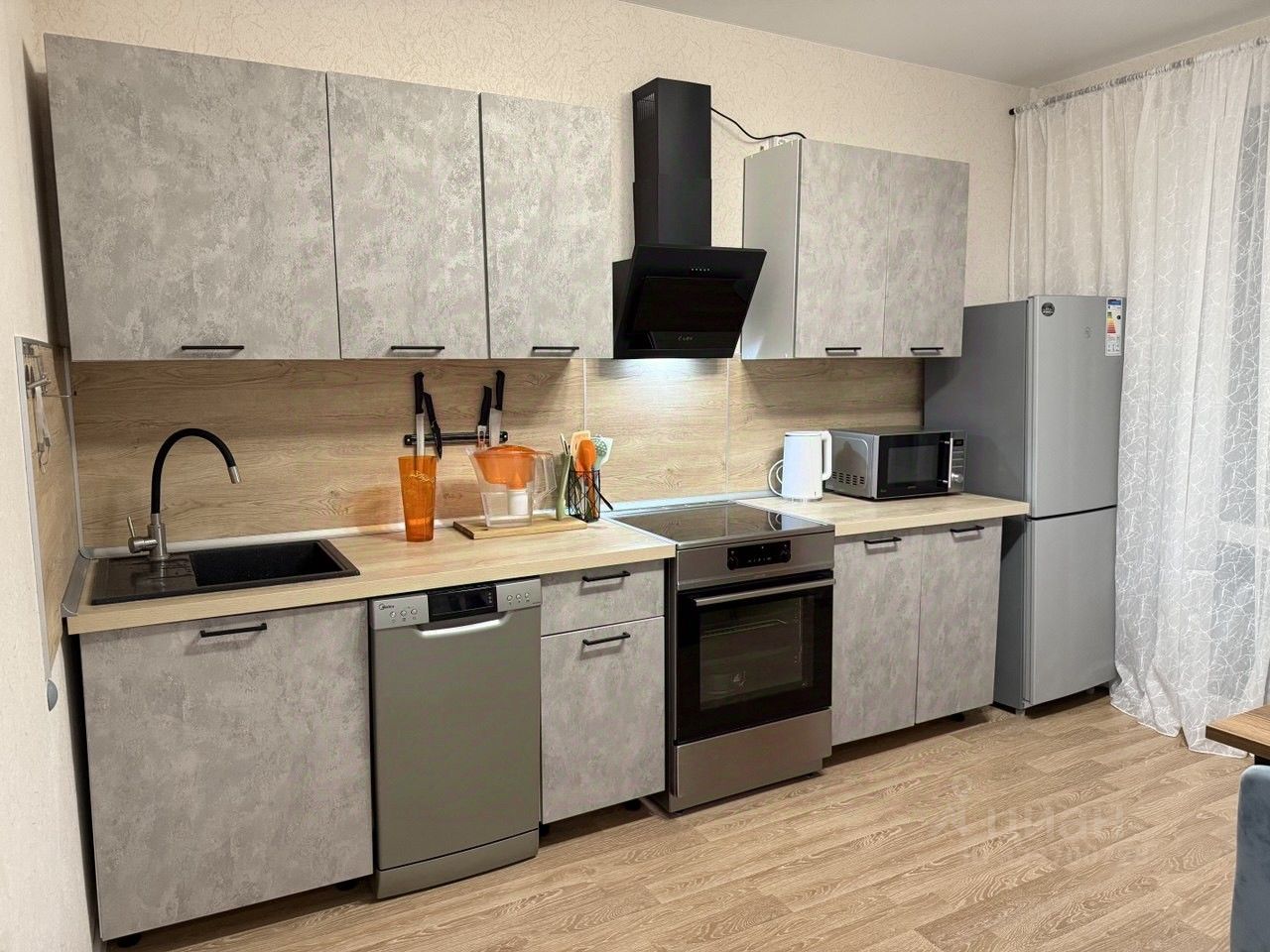 Кухонный гарнитур с техникой: посудомоечная машина, духовой шкаф, вытяжка, варочная панель, холодильник, микроволновая печь, чайник. Из уютной кухни выход на большую застекленную лоджию.