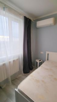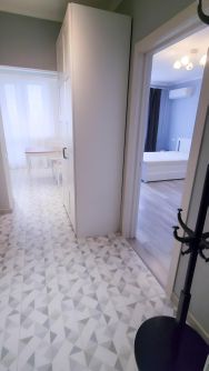 В квартире выполнен качественный ремонт, квартира оборудована современной мебелью и техникой: в коридоре вместительный шкаф, на кухне обеденный и кухонный гарнитур, со встроенной бытовой техникой, холодильник, в комнате распашной вместительный шкаф, кондиционер, спальное место с местами хранения, санузел раздельный, стиральная машинка. Лоджия застеклена. В доме консьерж. Отдельно - оплата воды, водоотвода (по счетчикам), света и консьержа.