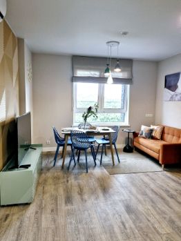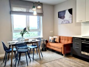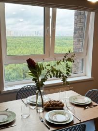 Квартира оборудована сплит системой кондиционирования и умным домом. В доме находится пекарня, рядом аптека, супермаркет, кофейня. Закрытый внутренний двор только для жильцов, за домом большой лесопарк, удобная транспортная развязка, метро Румянцево - 7 мин пешком.