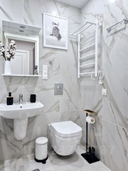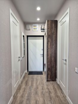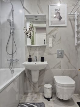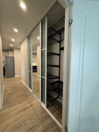 Совмещенный санузел выполнен в светлом керамограните, есть полотенцесушитель и шкаф для хранения. В коридоре встроенная ниша оборудована под гардеробную.