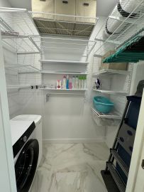 Прачечная оборудована удобной системой хранения, также в ней установлена стиральная машина, расположен беспроводной пылесос, утюг и гладильная доска.