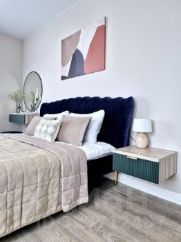Две спальни: светлая мастер-спальня с двуспальной кроватью и туалетным столиком, двумя окнами; вторая спальня-кабинет с раскладным ортопедическим диваном и рабочим столом.