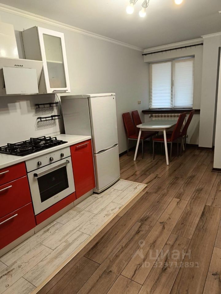 Эргономичный кухонный гарнитур со всей бытовой техникой: холодильник, духовой шкаф, электрическая плита, вытяжка.