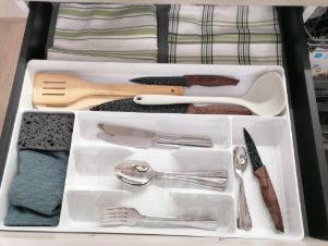 Сервиз на 2 персоны, столовые приборы, посуда для приготовления пищи.