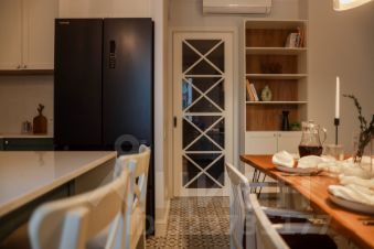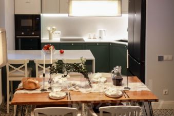 Вас будут окружать лоск и только качественные материалы: паркетная доска, керамогранит, мраморные подоконники, столешница кухни и острова из кварцита, высокие двери из массива дуба. Шикарный обеденный стол, рабочий стол и полки на балконе из массива дуба с живым краем.