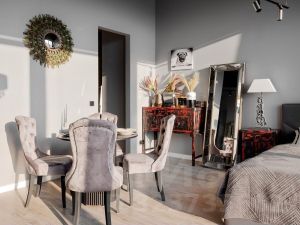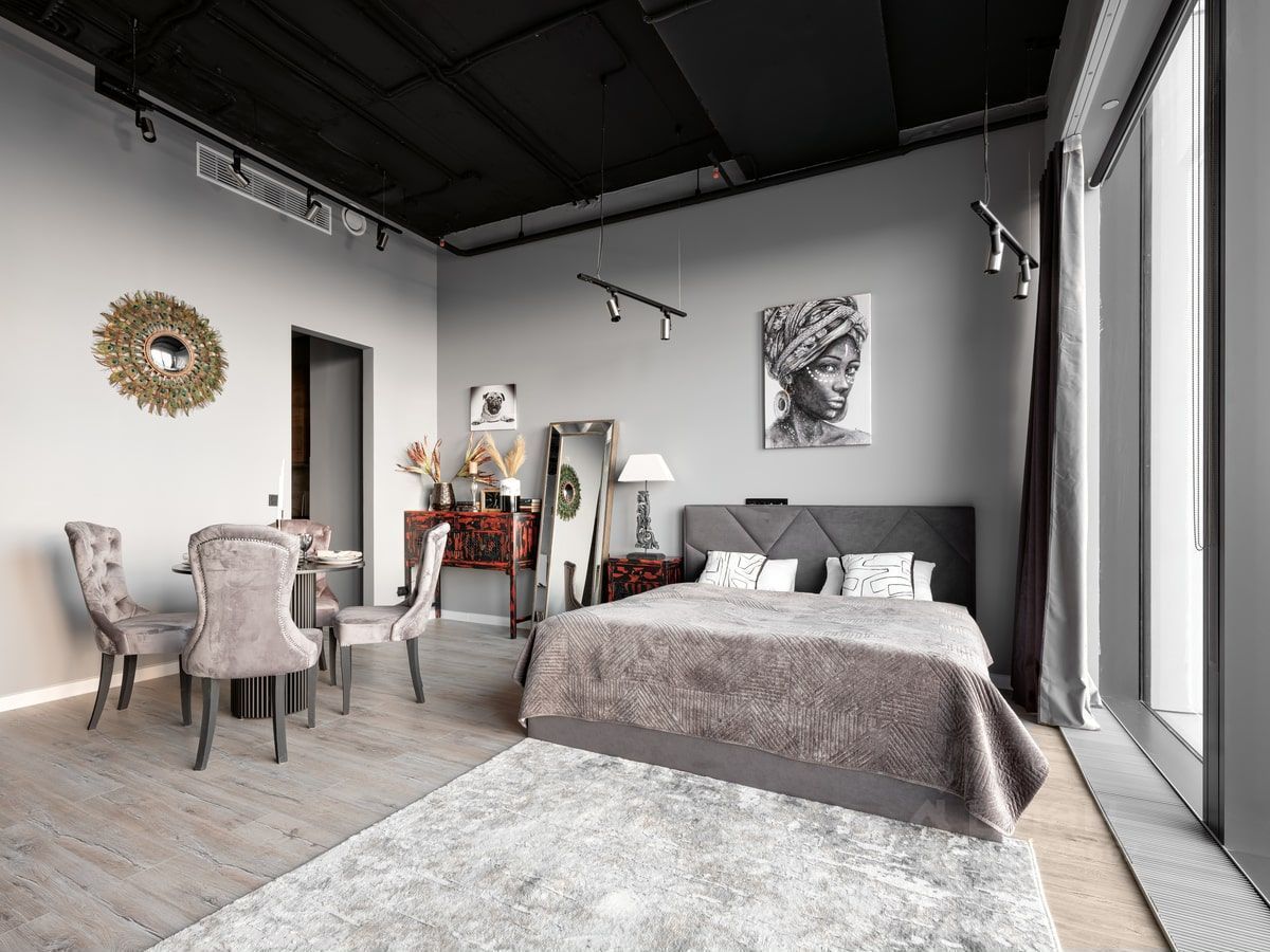 Просторная общая зона для комфортного отдыха и спальня с большой кроватью king-size для незабываемых моментов сна.