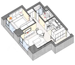 - кухонная зона: стол с двумя стульями, кухонный гарнитур со всей необходимой бытовой техникой и посудой.
