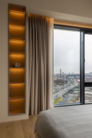 Функциональная планировка с большой гостиной/кухней с 2умя панорамными окнами, спальней с угловым остеклением и видами на реку и Воробьевы горы, отдельной гардеробной с постирочным блоком.