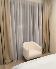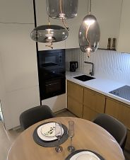 умный бризер, инверторные кондиционеры, винный холодильник, система фильтрации воды, измельчитель бытовых отходов, беспроводной пылесос, умный унитаз,электрические умные карнизы, посудомоечная машина, телевизор 65" и стирально-сушильная машина. Интерьер выполнен с использованием натурального дерева и камня.
