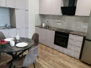 В зоне кухни: индукционная варочная панель, электрическая духовка, посудомоечная машина, вытяжка, холодильник. Смеситель с опцией подключения фильтра. Раскладной стол с приятными стульчиками. Много полок и ящиков для хранения.