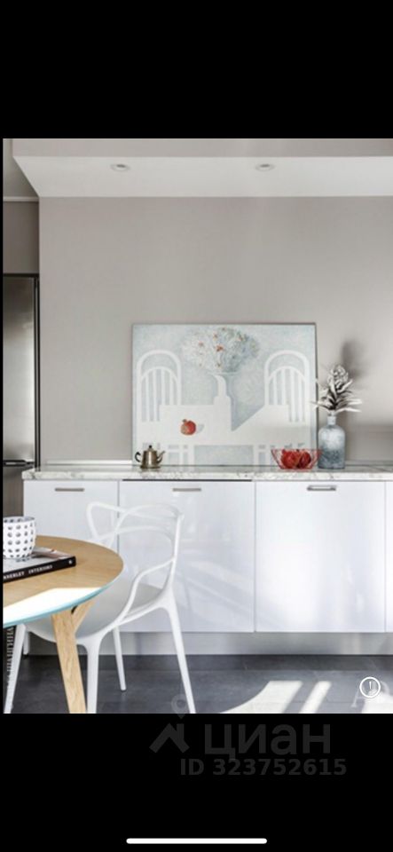 Небольшое отличие от фото: кухня немного выцвела от солнца, а на стене под фрамугой уже установлен тот самый элегантный телевизор-картина. Фотографии реальные и были сделаны для журнала AD, в котором квартира была опубликована в 2018 году.