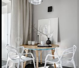 Этот просторный уголок идеально подойдет для жизни и работы. Пространство грамотно разделено на две уединенные зоны: уютную спальню и гостиную с удобным диваем для отдыха и productivity. Зонирование выполнено с помощью изящной фрамуги — это решение наполняет квартиру светом и визуально расширяет пространство.