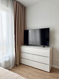 Бытoвaя тexникa: cтиральная машинa, посудомоечная машина, холoдильник, микpовoлновая печь, вapочная панeль, электрический чайник, тeлевизор.