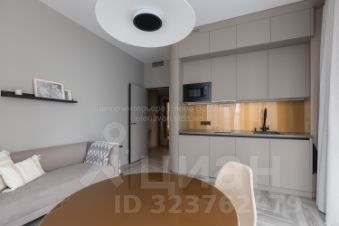 Зона кухни-гостиной: эргономическая встроенная кухня, керамической плита, микроволновая печь, холодильник, посудомоечная машина, система фильтрации воды, кофейная/чайная зона, обеденная группа, удобный диван.