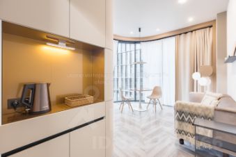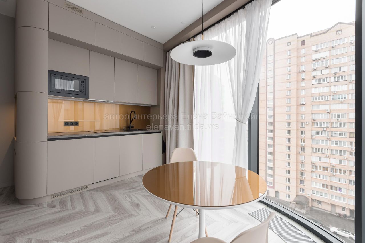 Зона кухни-гостиной: эргономическая встроенная кухня, керамической плита, микроволновая печь, холодильник, посудомоечная машина, система фильтрации воды, кофейная/чайная зона, обеденная группа, удобный диван.
