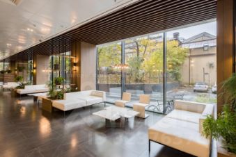 Презентабельная входная группа. Ресепшн, большая лаунж-зона с камином.