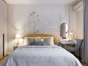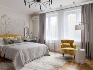 Спальня: кровать с матрасом, большой шкаф для вещей, рабочий столик с креслом, кресло для чтения, кондиционер, 2 шкафа для мелочей и тумба. Светлая спальня, благодаря 2м большим окнам.