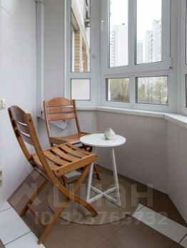 Балкон застеклен, имеются тёплые полы. На балконе есть шкаф для хранения, оборудована зона для отдыха со столиком и стульями.