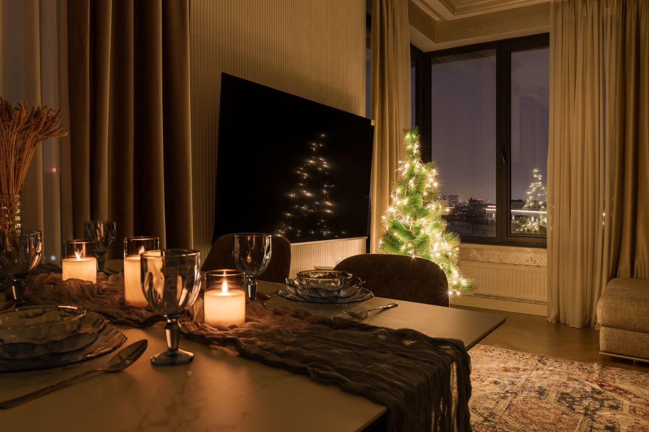 оборудованная кухня с индукционной плитой, холодильником, микроволновкой, посудомоечной машиной и электрическим чайником;