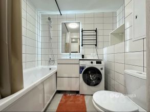 Санузел: ванна 170 см, раковина 120 см с белым ящиком и стиральной машиной, зеркало с подсветкой, электрический водонагреватель.