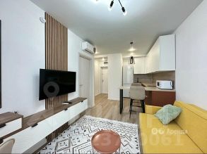 Гостиная: желтый диван с декоративными подушками и местом для хранения (раскладывающийся со спальным местом), консоль под телевизор, консольный туалетный столик с большим зеркалом и стулом, телевизор 43 дюйма, двухсторонний орнаментальный лёгкий ковер, блэкаут шторы с тюлью (цвет бежевый). Кондиционер, который охлаждает целиком всю квартиру (есть функция обогрева).