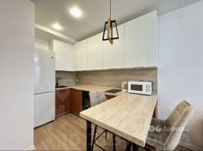 Кухня: кухонный гарнитур (верх белый, низ терракотовый) с холодильником (No frost), духовым шкафом, индукционной варочной панелью, посудомоечной машиной, микроволновкой и чайником. Барная стойка с двумя полубарными стульями для приема пищи.