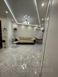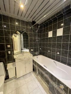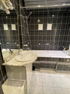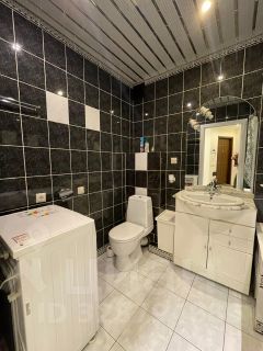 В гостиной раскладывающийся диван. Просторный санузел оборудован полноценной ванной, там же установлена современная стиральная машина.