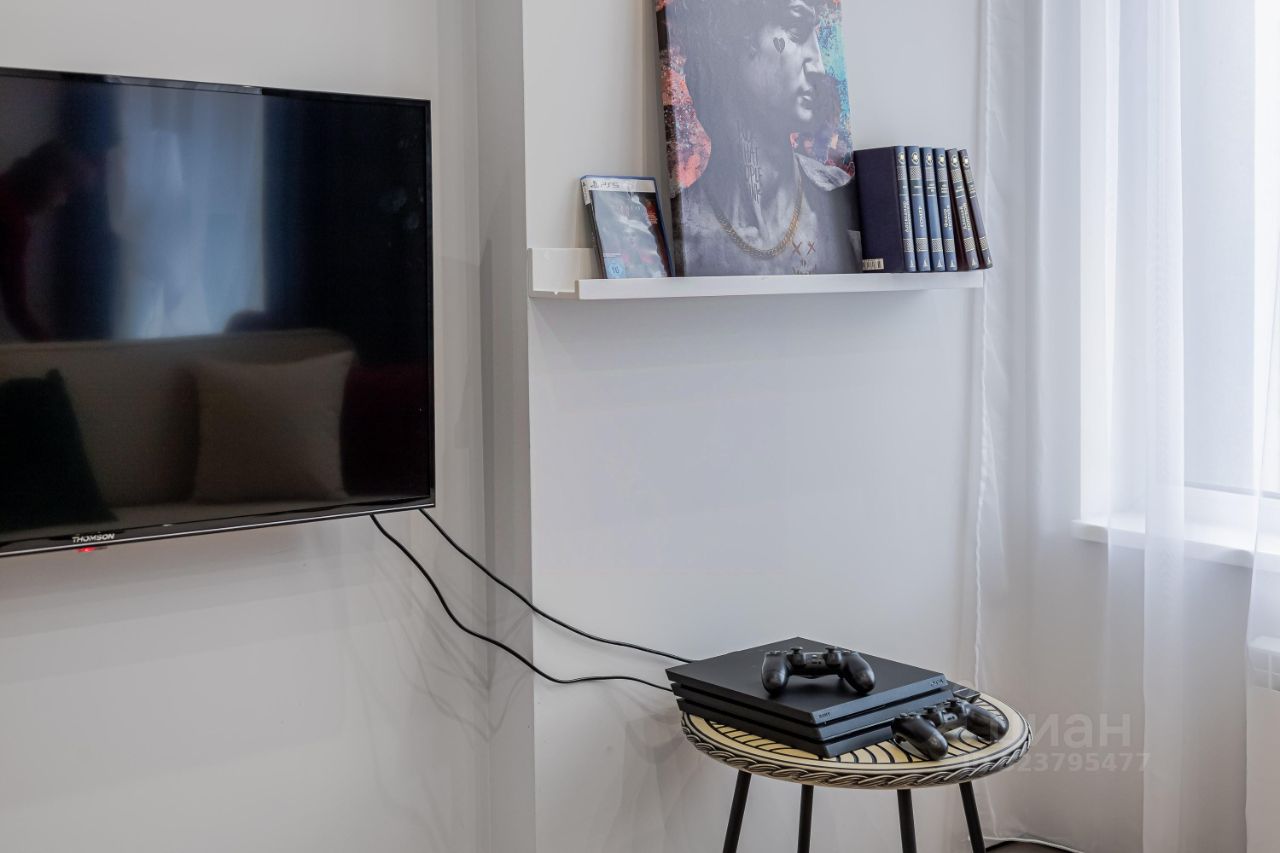 В гостиной расположен большой диван, а также телевизор с функцией Smart TV и игровой приставкой.