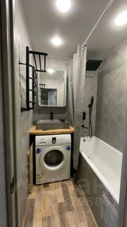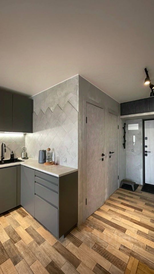 Кухня и ванная выполнены в современном минималистичном стиле с элементами индустриального дизайна: бетон, дерево и спокойные серые тона создают уют и ощущение уединения в центре большого города.
