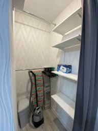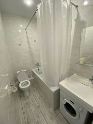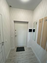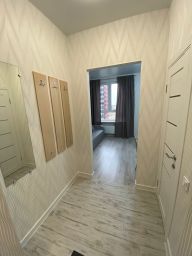 Выполнен качественный дизайнерский ремонт: на полу в комнатах ламинат, в прихожей, санузле плитка; большое окна ПВХ, ровные потолки встроенная кухня со всей необходимой мебелью и техникой, гардеробная, совмещенный санузел в плитке - с ванной, застекленная лоджия.