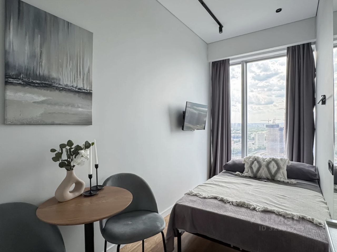 Студия выполнена в современном минималистичном стиле: приглушённые пастельные оттенки, панорамные окна, много света, продуманная планировка и комфортное пространство для жизни и работы.