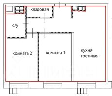 Кухня и гостиная совмещены в единую зону. Санузел с ванной. Кладовая. Две изолированные комнаты.