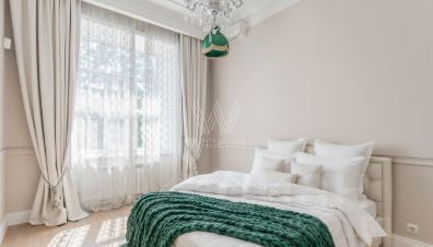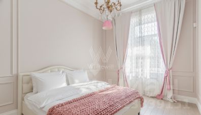 Квартира полностью укомплектована классической мебелью. В гостиной обустроена зона отдыха с уютными креслами и столовая зона на 6 персон. Спланирована отдельная кухня со встроенной техникой Siemens и обеденным столом. Большие окна наполняют комнаты светом.