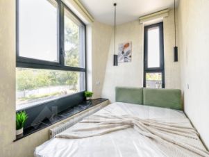 Уютные апартаменты, обустроенные всем необходимым для комфортного проживания. Встроенная кухня, микроволновка, стиральная машина, полноценная кровать, большой шкаф, есть возможность разместить дополнительные места хранения, большие панорамных окна выходят в благоустроенный двор и на реку.