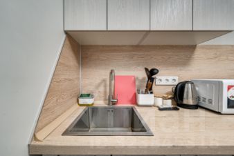 - Оборудованная мини-кухня (холодильник, варочная панель, микроволновая печь, электрический чайник).