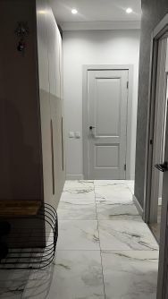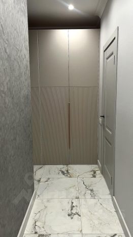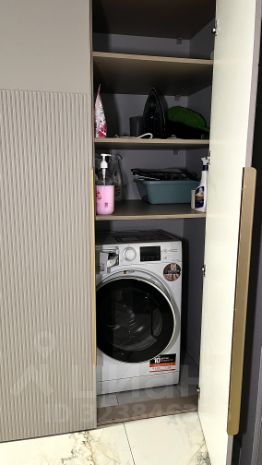В коридоре предусмотрен шкаф с эргономичной системой хранения вещей и встроенной стиральной машиной.