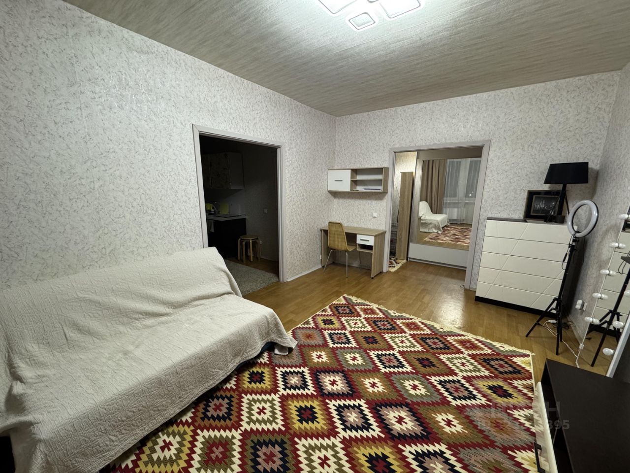 Квартира с косметическим ремонтом, полностью меблирована. На кухне гарнитур, новая обеденная группа, и в комнате есть вся необходимая мебель: удобный раскладной диван, рабочее место, комод, большой зеркальный шкаф-купе . В квартире установлены холодильник и стиральная машина. Санузел совмещенный, оборудован ванной. С кухни выходит застекленный балкон, где можно насладиться свежим воздухом. Для вашего удобства в доме есть три пассажирских лифта и мусоропровод.