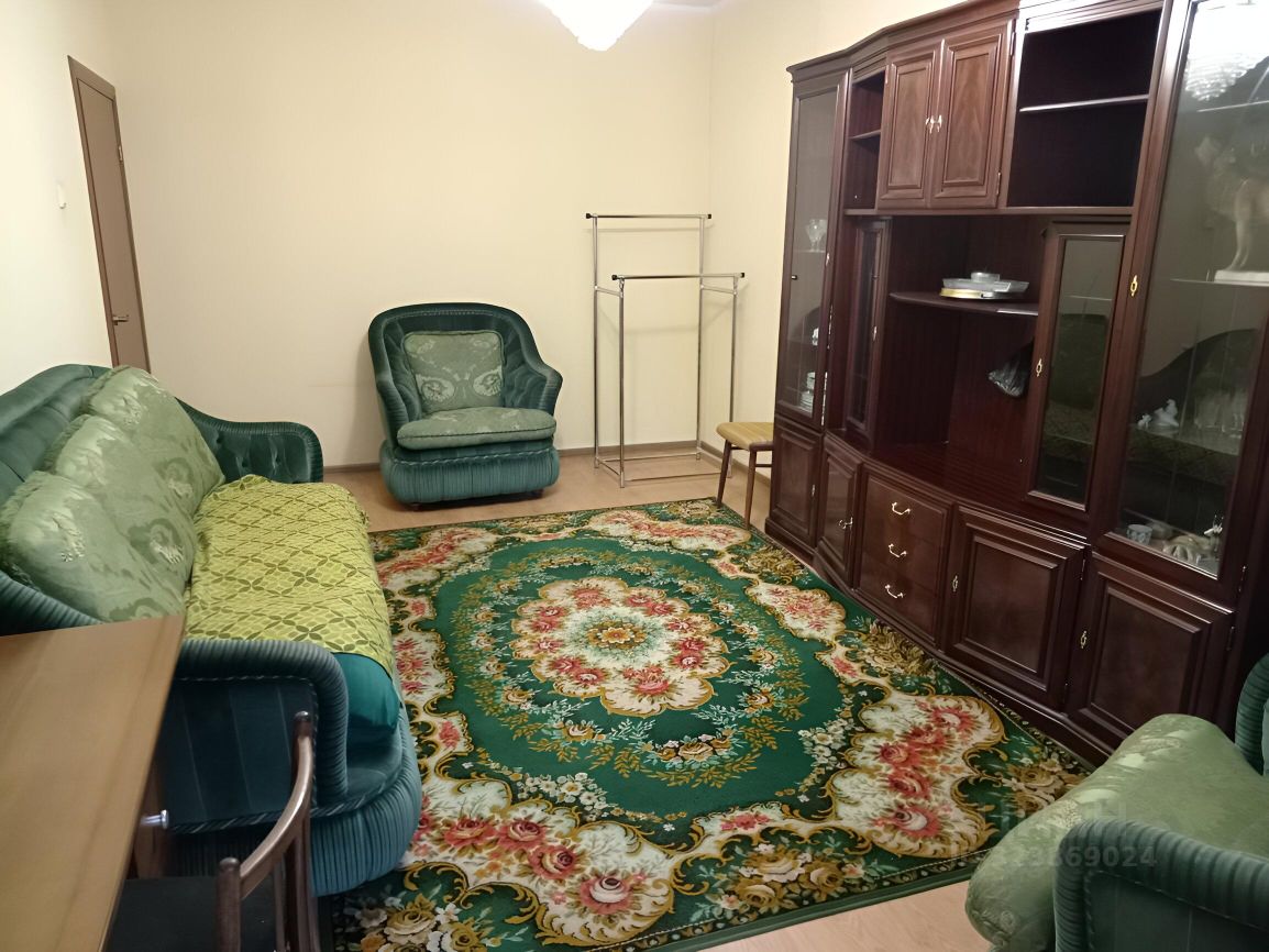 В комнате пластиковые окна, диван с раскладывающейся кроватью, два кресла, письменный стол, небольшая стенка, журнальный столик, кондиционер, ковер, выход на застекленный балкон.