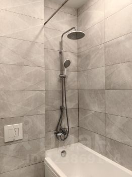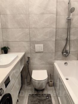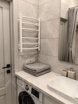 Ванна оборудована стиральной машиной и электрическим полотенцесушителем.