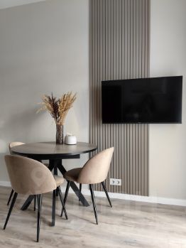 В зоне гостиной расположен раскладной диван для отдыха или просмотра фильмов, имеется телевизор. Просторная кухня со всей необходимой техникой: холодильник, плита, духовой шкаф, микроволновая печь, вытяжка, посудомоечная машина, чайник, тостер, фильтр для воды.
