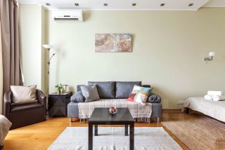 Уютная комфортная квартира, двухместная кровать с ортопедическим матрасом, удобный раскладной диван, эркерная зона с креслами, журнальный столик, рабочий стол для ноутбука, смарт телевизор с кабельными каналами, Wi-Fi. Встроенная кухня, кухонный гарнитур, кондиционер, холодильник, газовая плита, посудомойка, микроволновка, чайник, кофеварка.