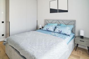 Полностью готова к заезду. Вся мебель новая и функциональная: диван в гостиной, раскладывающийся в спальное место, двуспальная кровать в спальне, встроенный шкаф-купе в спальне, распашной шкаф в прихожей.