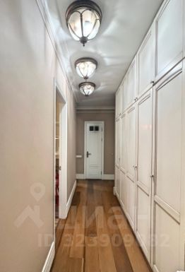 В прихожей большой встроенный шкаф. На полу ламинат и паркетная доска из тика.