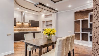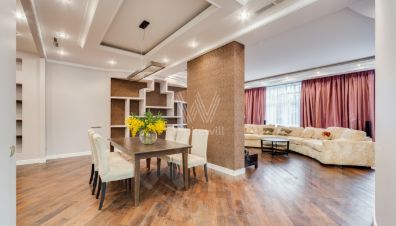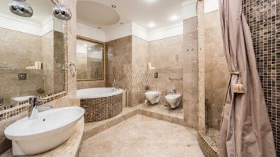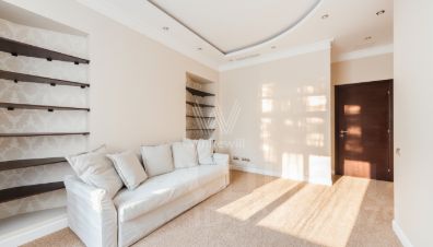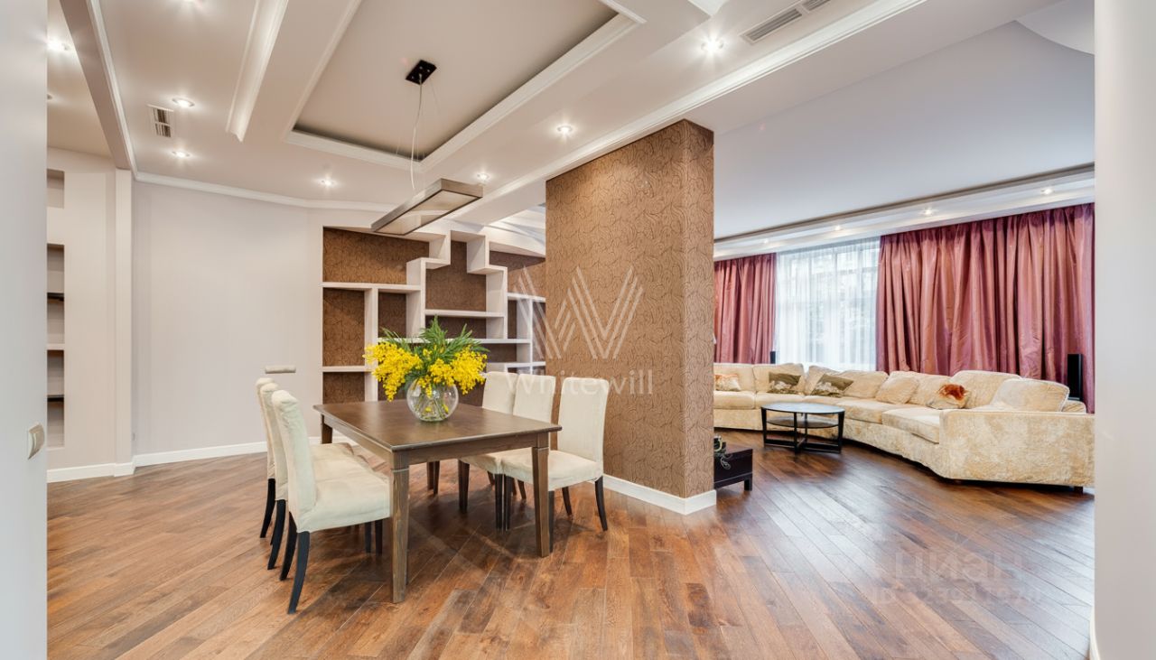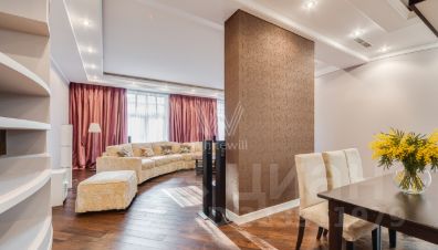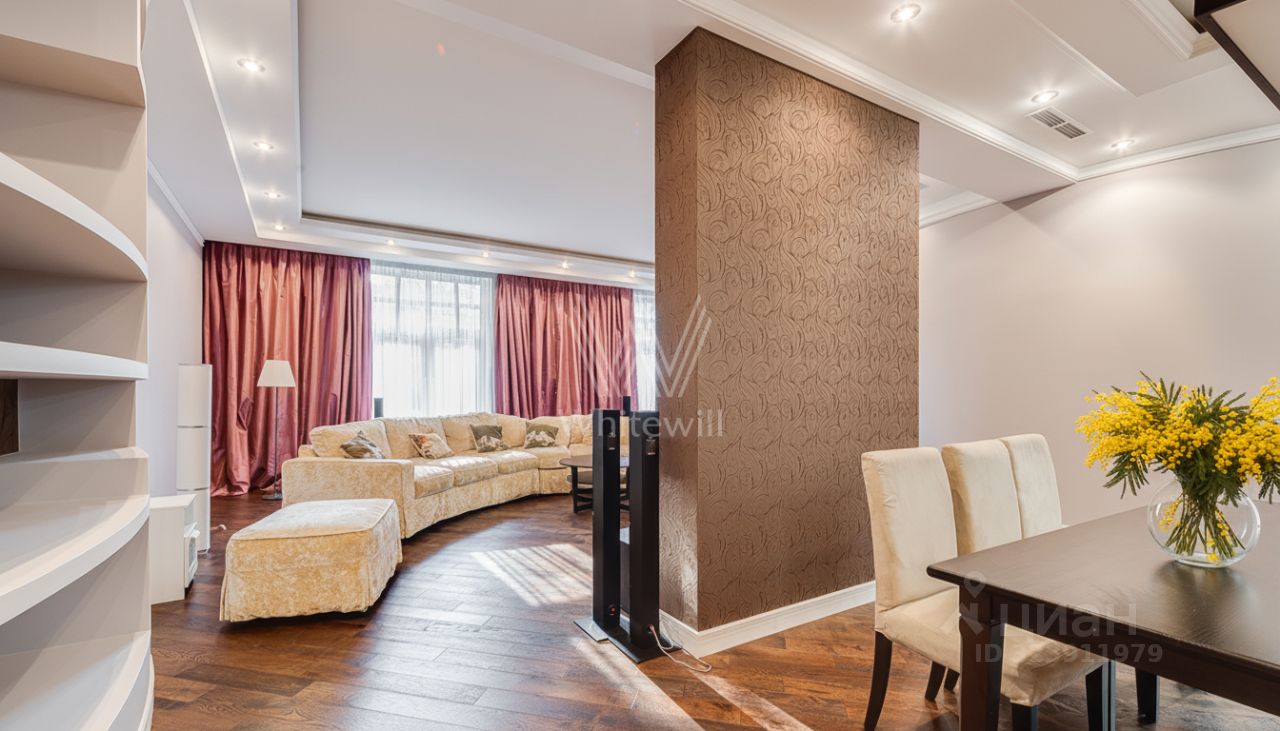 Планировка: просторная гостиная, кухня, 3 спальни, 2 ванные комнаты, гостевой санузел, 2 гардеробные комнаты. Высокие многоуровневые потолки со встроенными светильниками. Из панорамных окон открывается вид на Смоленскую набережную и башни "Москва-Сити". Предусмотрено машиноместо в подземном паркинге.