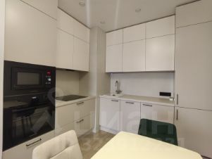 Кухня встроенная с техникой (варочная панель, холодильник встроенный, вытяжка, духовка, микроволновка), обеденная группа: стол + 4 стула, диван.