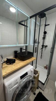 В ванной стиральная машина с сушкой, зеркальный шкаф с подсветкой, душевая кабина с тропическим душем.