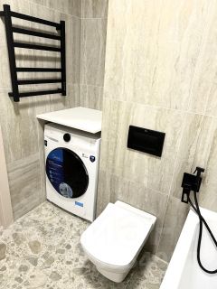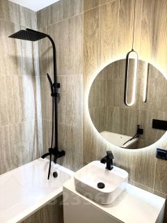 В санузле современная сантехника: гиг-душ, тропический душ, зеркало с подсветкой, реагирующей на взмах руки, большая ванна.