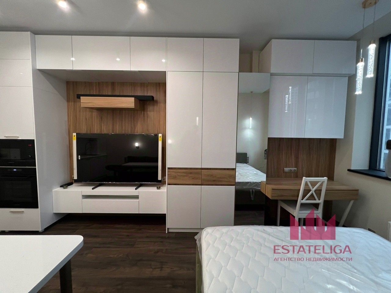 Просторная студия включает в себя светлую спальню с рабочей зоной, уютную гостиную, оборудованную техникой кухню и санузел с душевой.