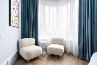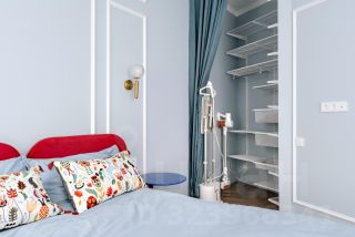 В изолированной спальне установлена кровать с ортопедическим матрацем, роскошное кресло. Изюминка- обустроенная и продуманная гардеробная.
