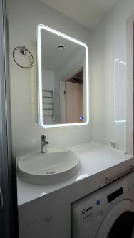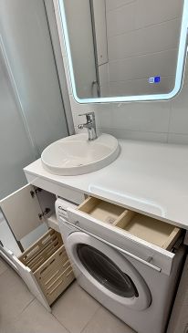 В санузле удобная раковина с крылом и ящиками для белья и принадлежностей, шкаф с подсветкой и полками, стиральная машинка с сушкой , электрический полотенцесушитель.
